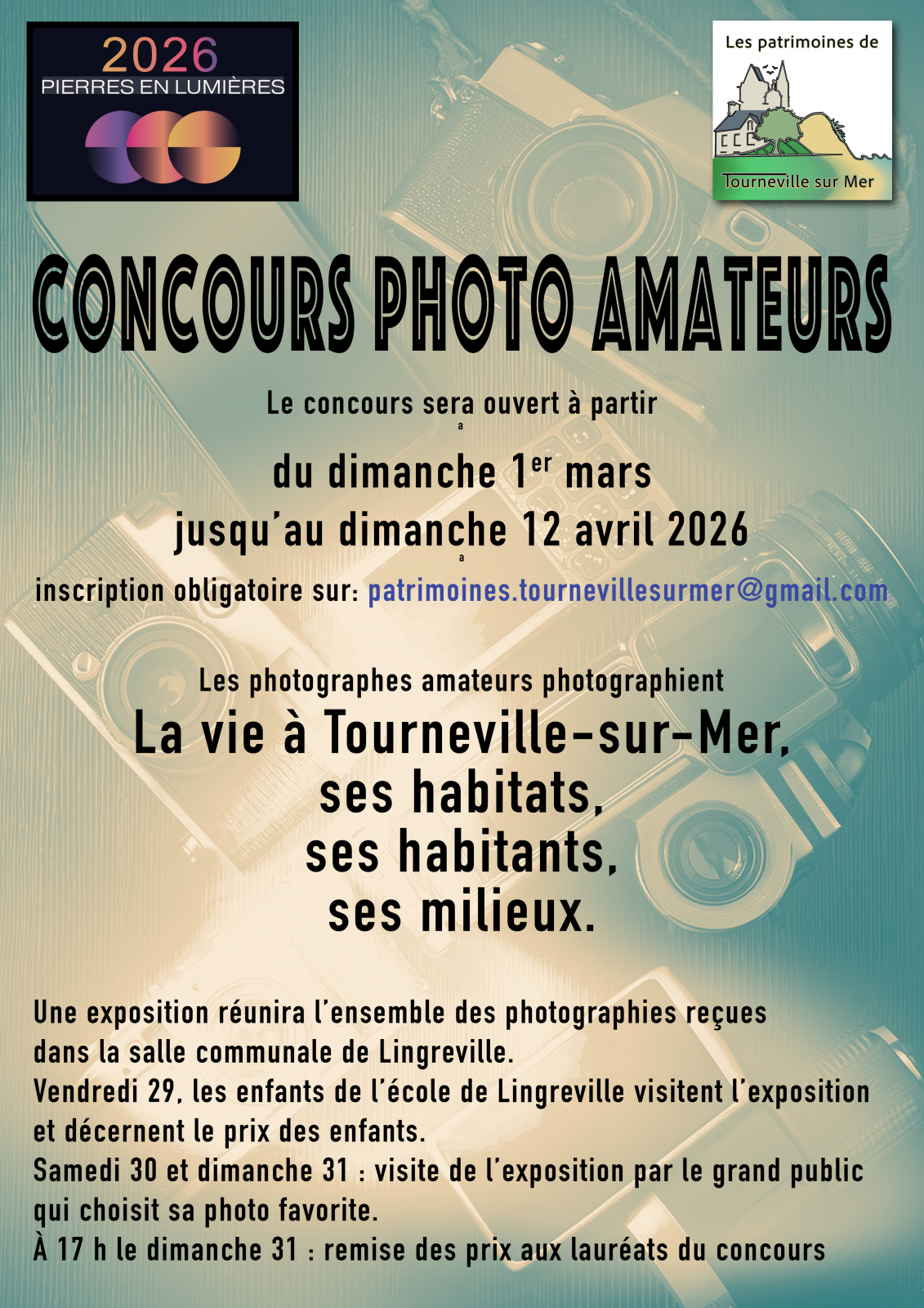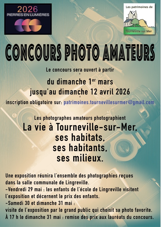 A l’occasion de « Pierres en lumière », l'association « Les patrimoines de Tourneville-sur-Mer » organise un concours photo amateurs. L’objectif est de proposer aux habitants de réaliser une photographie prise dans la commune de Tourneville-sur-mer. Chacun pourra choisir le sujet de son choix - paysage, habitat, monument, habitants, etc.- le tout donnera à lire une sorte de portrait de la commune vue par ses habitants.