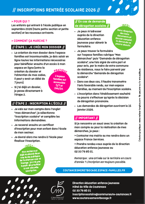 Depuis le 1er mars 2023, les inscriptions dans les écoles publiques du territoire de de la CMB se font de matière dématérialisée via cet Espace famille, https://coutancesmeretbocage.espace-familles.fr/, il n’est donc plus obligatoire de se rendre en mairie pour effectuer l’inscription. Pour procéder à l’inscription scolaire, il faut au préalable avoir créé son dossier sur l’espace familles. Après validation de votre dossier, vous pourrez faire votre demande d’inscription scolaire directement depuis la plateforme. Vous recevrez une validation et pourrez alors vous rendre à l’école pour finaliser l’inscription. Pour inscrire votre enfant à l’école, il vous sera demandé un justificatif de domicile de moins de trois mois, une copie du livret de famille ou la décision de placement de l’enfant dans la famille, une copie du carnet de santé avec les pages sur les vaccins obligatoires de chaque enfant.